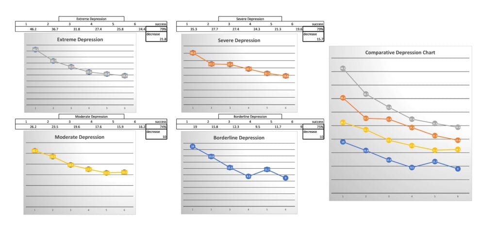 Charleston Ketamine Center has tracked its results with patients in categories ranging from Extreme to Borderline Depression. Each chart shows a definitive decrease (30% or greater) in close to 4 out of 5 patients trying a series of 6 initial infusions. Scoring based on patients filling out Beck’s Depression Inventory on each visit.